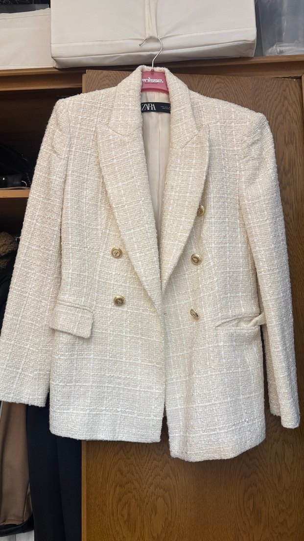 Düğmeli beyaz kadın blazer, notched lapel yakaya sahip. Normal kesim, uzun kollu ve dokulu sentetik kumaştan üretilmiştir. Ofis için uygun, klasik şehir tarzı. Krem renk