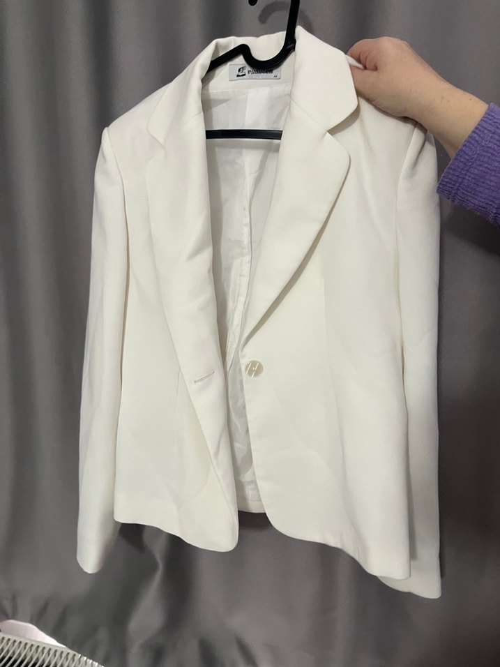 Düğmeli, notched lapel yakalı beyaz kadın blazer. Normal boy, regular fit ve uzun kollu, sentetik kumaştan üretilmiştir. Ofis ve günlük kullanıma uygundur.