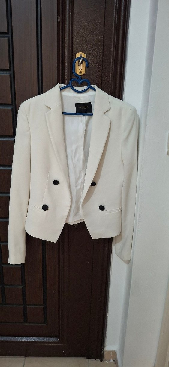 Düğmeli önü ve uzun kollu,beyaz renkli, normal boy midi uzunlukta, regular fit kadın blazer ceket.