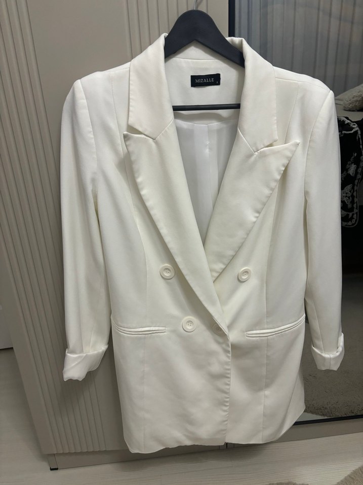 Bu beyaz kadın blazer ceket, keskin yakalı ve düğmeli ön tasarıma sahiptir. İpeksi kumaştan yapılmış, askılı kollu ve normal midi boyda, ofis ve sokak stili için uygundur. ✨