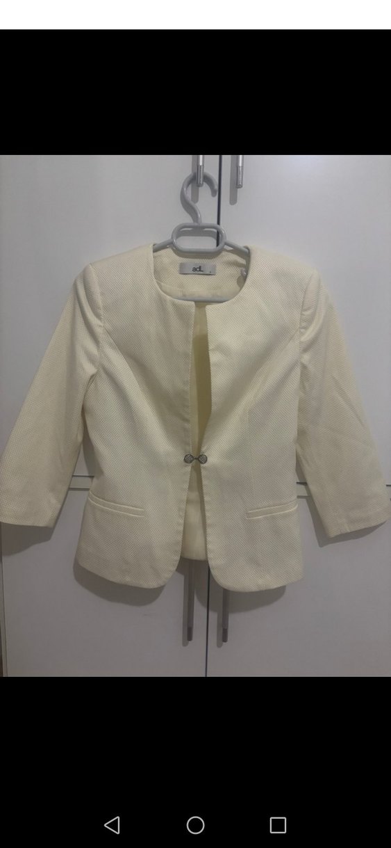 Düğmeli, uzun kollu ve regular fit beyaz kadın blazer ceket. Modern klasik tarzda, ofis kullanımı için uygun, yumuşak sentetik kumaştan yapılmıştır.