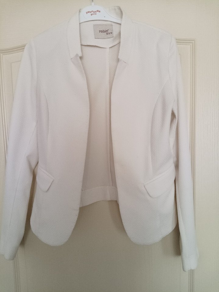 Düğmeli beyaz kadın blazer ceket, klasik yakalı ve uzun kolludur. Normal boyda, sentetik kumaştan yapılmıştır, ofis ve sokak stili için uygundur. ✨