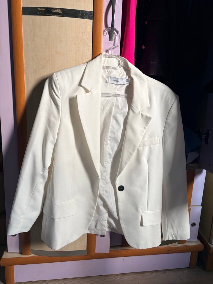 Beyaz renkli, düğmeli, notched lapel yakalı kadın blazer. Normal kesim, uzun kollu ve midi boyda, sentetik kumaştan üretilmiştir. Ofis ve sokak modasına uygun.