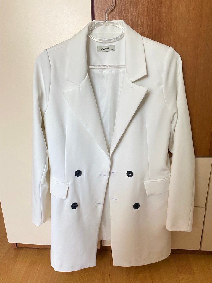 Beyaz düğmeli kadın blazer ceket, kesik yaka, uzun kollu ve midi boyda, rahat kesim ve sentetik kumaştan üretilmiştir. Ofis ve günlük kullanıma uygundur. ✨