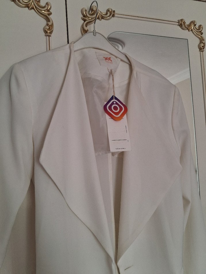 Düğmeli, uzun kesim, beyaz blazer ceket. Notch yaka ve uzun kolludur. Sentetik yumuşak kumaştan üretilmiştir, rahat ve şık bir görünüme sahiptir.