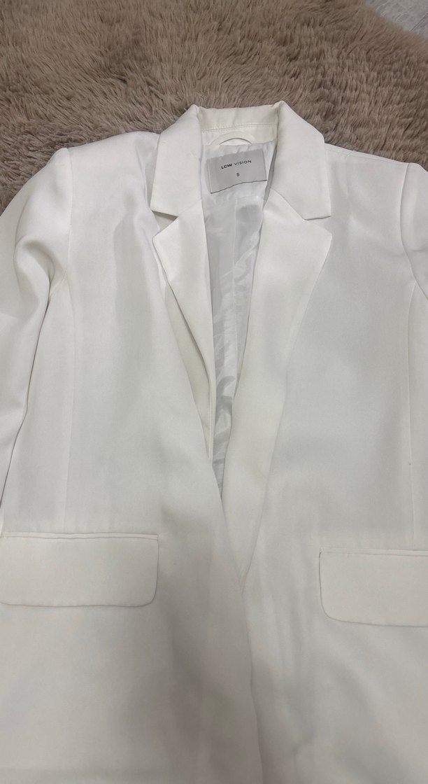 Düğmeli, uzun kollu, beyaz kadın blazer ceket. Normal midi uzunlukta, satenimsi kumaştan, ofis için uygun, sade ve şık.