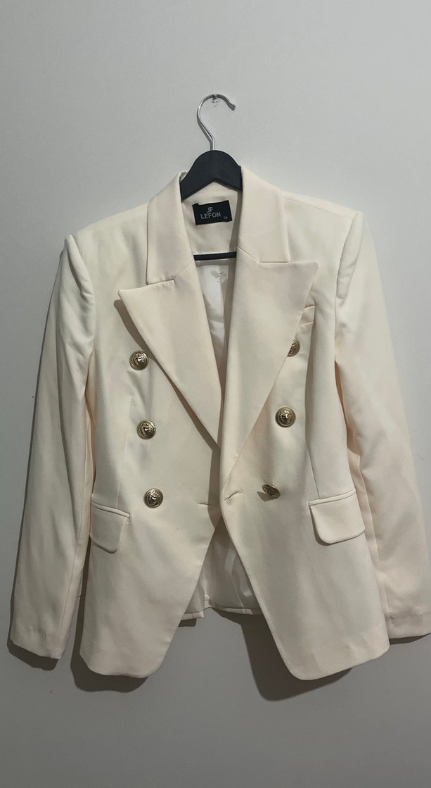Düğmeli, beyaz kadın blazer ceket. Notlu yaka, uzun kollu, normal uzunlukta ve ipeksi dokulu. Ofis ve sokak stiline uygun. Göğüs 86 Boy 64
