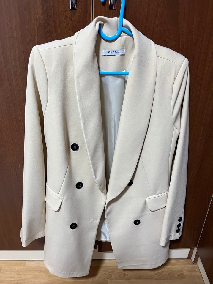 Düğmeli, notched lapel yakalı beyaz kadın blazer ceket. Uzun kollu, midi boy, düz kesim ve sentetik kumaştan üretilmiştir. Ofis ve günlük kullanıma uygundur.