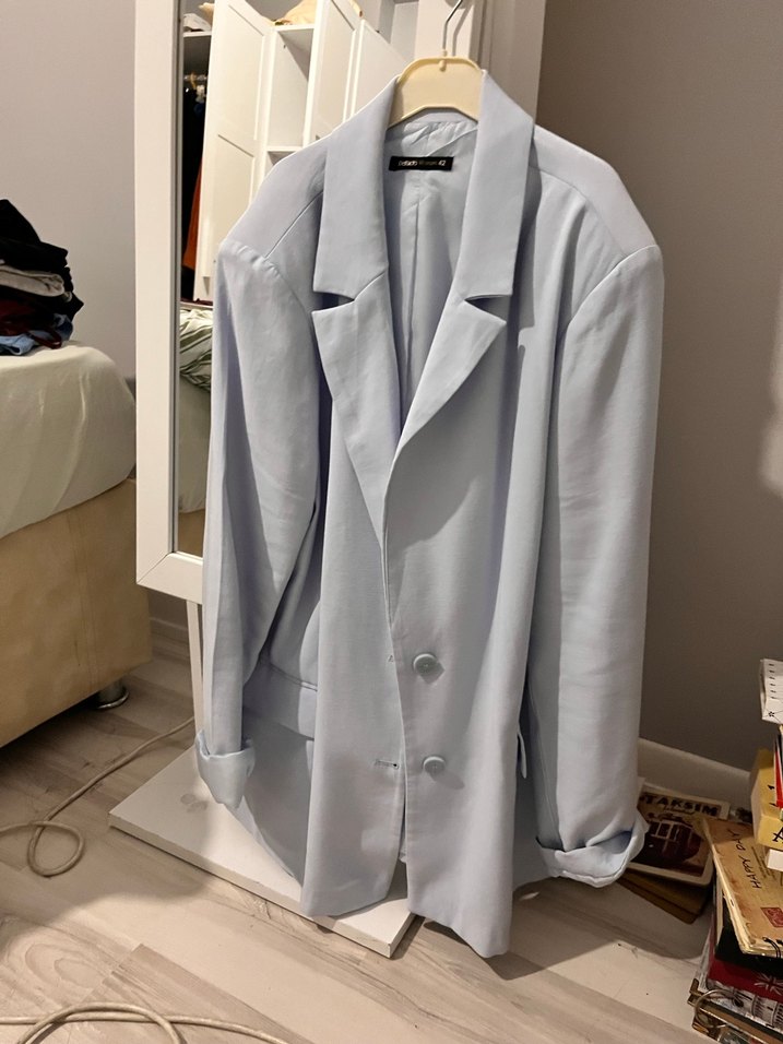 Kadınlar için düğmeli, yakalı, uzun kollu beyaz blazer ceket. Normal kesim ve midi boyda, ipeksi dokuda, desensiz ve pastel tonlarda, ofis için uygun.