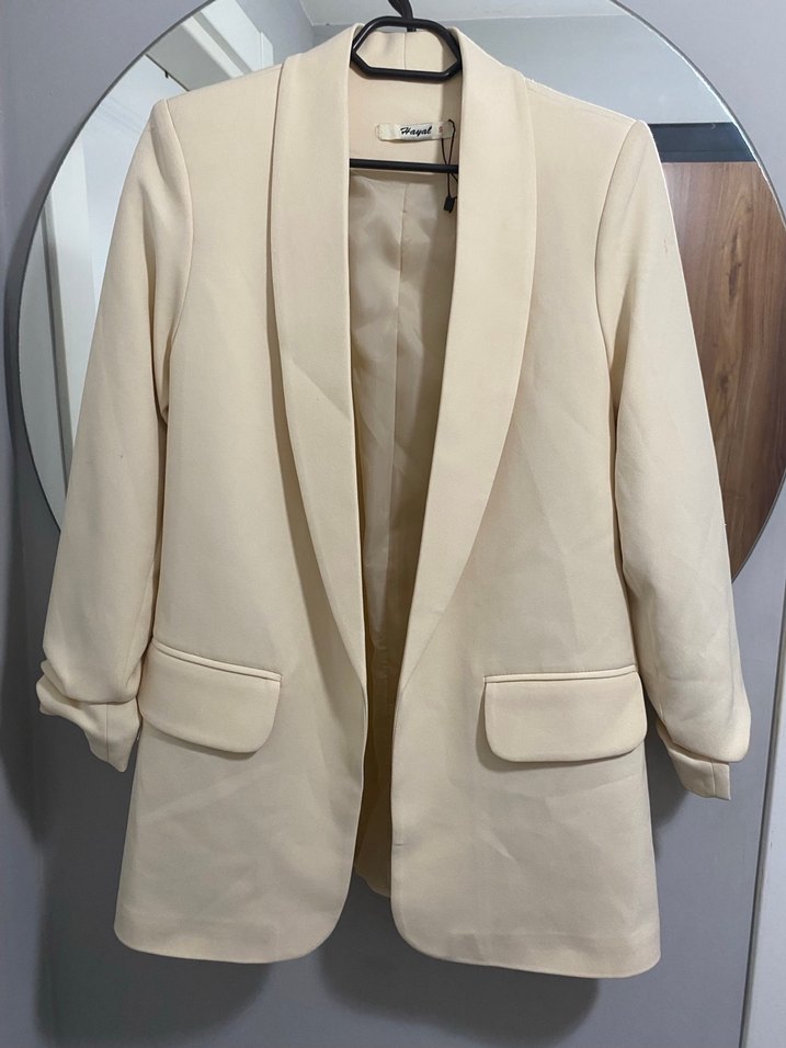 Düğmeli, uzun kollu, beyaz kadın blazer ceket. Normal boy ve regular kesim, sentetik kumaştan, ofis ve günlük kullanıma uygun.