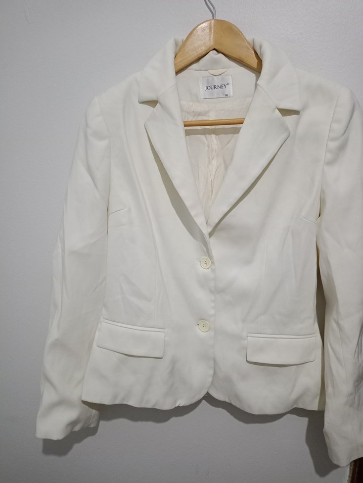 Düğmeli, beyaz kadın blazer ceket; yakalı, uzun kollu, hafif keten kumaştan, normal boy ve regular fit ile ofis için uygun klasik şıklık sunar.