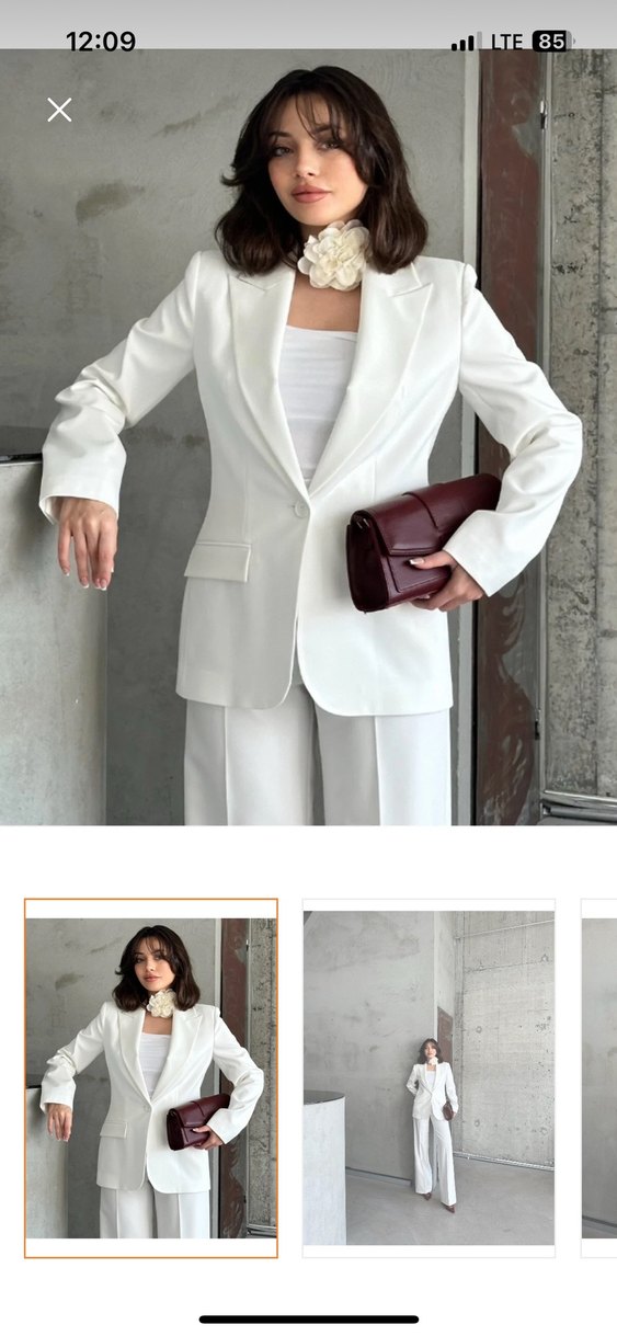 Beyaz kadın blazer, düğmeli ön, uzun kollu ve normal midi boyda. Ofis için klasik şıklık ve düzenli kesim sunar. Pantolonuyla takım nikahımda giydim bir kez hiçbir kusuru yok
