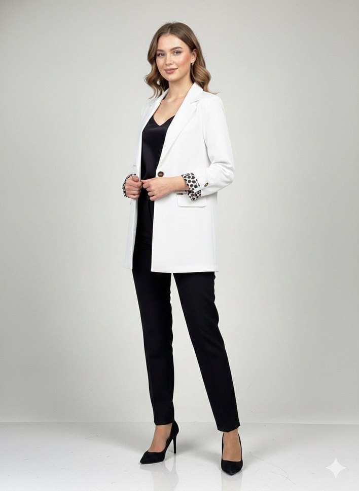 Düğmeli beyaz kadın blazer, yılan desenli manşetlerle uzun kollu ve kesik yaka detaylarına sahiptir. Normal kesim ve midi boyda, ofis için uygundur.