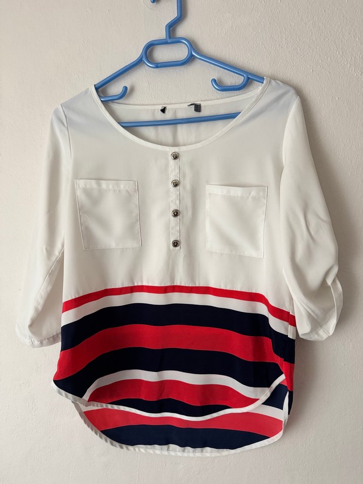 Düğmeli, kısa kollu beyaz kadın bluz, salaş kesim ve tekne yaka detayına sahiptir. Alt kısmında kırmızı, lacivert ve beyaz çizgili baskı bulunur. İki cep ve sentetik kumaş kullanılmıştır.