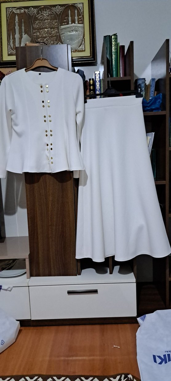 Düğmeli Beyaz Kadın Bluz ikili takım ETEK BEL 36 BOY 95