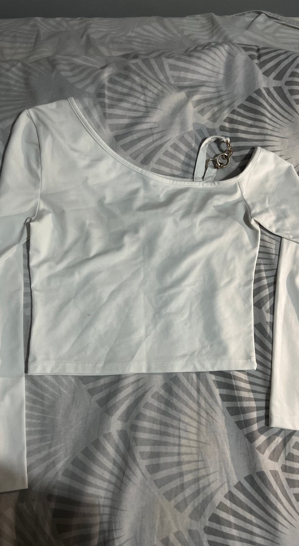Kayık yakalı, uzun kollu beyaz kadın bluz, düğmeli ve dar kesim. Pürüzsüz sentetik kumaştan, minimal ve şık bir görünüm için uygundur.