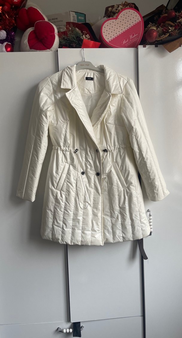 Düğmeli ve kısa kesim beyaz kadın ceketi, yakasında klasik yaka detayı vardır. Rahat kalıplı ve sentetik dokulu kumaştan üretilmiştir. Marka temsilidir butikten alınmıştır