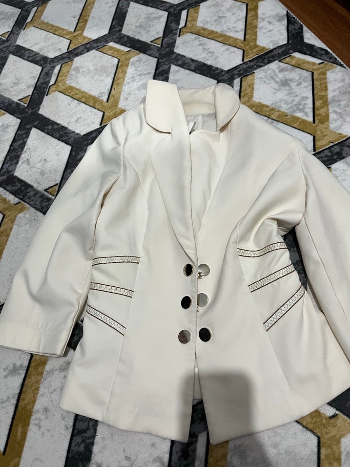 Düğmeli önü, kesilmiş yaka ve uzun kollu beyaz kadın ceket. Regular fit, kısa boy ve yanlarda dikiş detayları bulunur. İş ve sokak tarzına uygun, günlük kullanıma ideal.