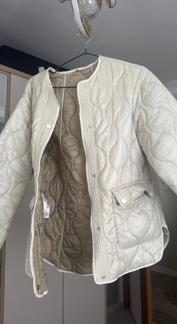 Beyaz, düğmeli, uzun kollu ve çıtçıtlı, rahat kesim kadın ceket. Modern ve sokak modasına uygun, gündelik kullanıma uygun. Bir süre kullandım düğmelerinde hafif soyulma var. Görsellerde belli