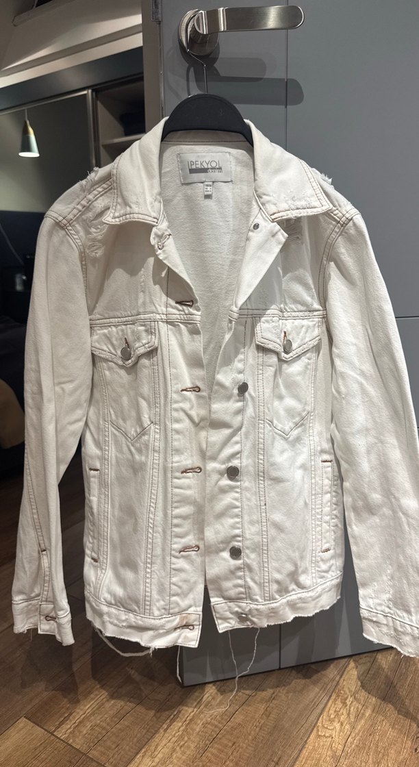 İpekyol kot ceket. Çok az giyildi. Fakat ufak lekesi yüzünden uygun fiyata koyuyorum. Kuru temizleme ile çıkabilir. Düğmeli ön kısmı, bol kesimi ve uzun kollara sahip beyaz denim ceket. Notlu yaka ve midi uzunluğunda, günlük rahat stil için uygundur.