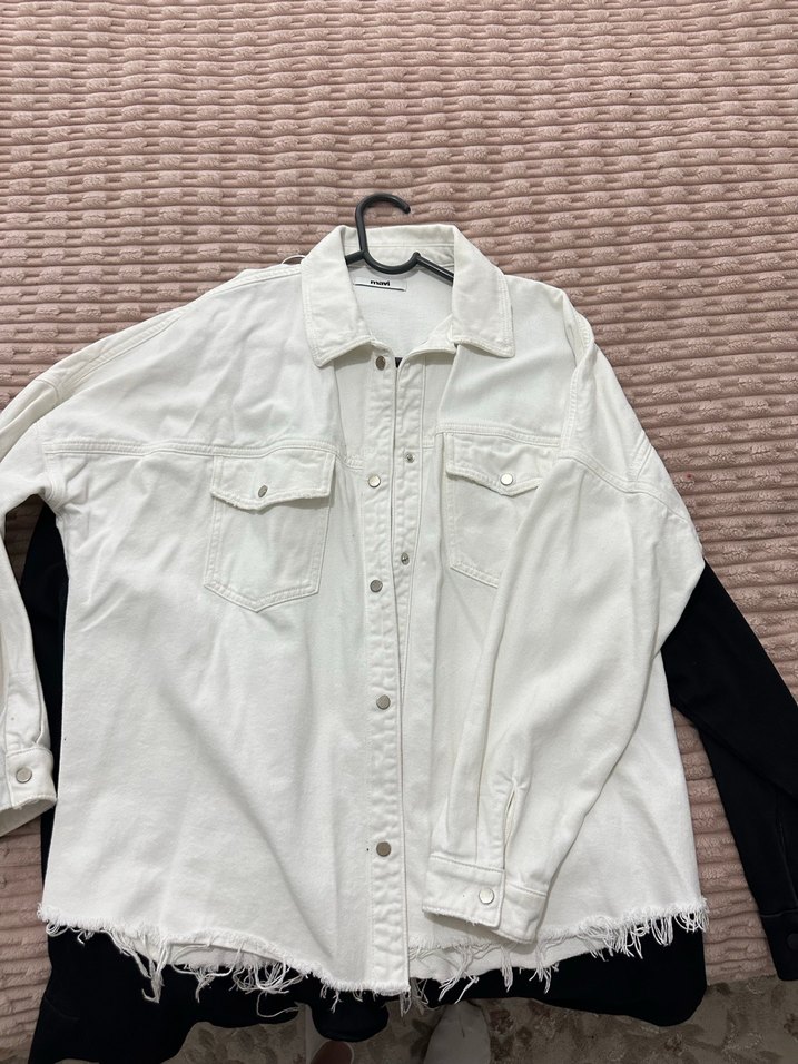 Pamuk kumaştan yapılmış, düğmeli ve cep detaylı beyaz denim ceket. Uzun kollu, yakalı ve salaş kesim. Alt ucu tırtıklı, günlük kullanıma uygun.