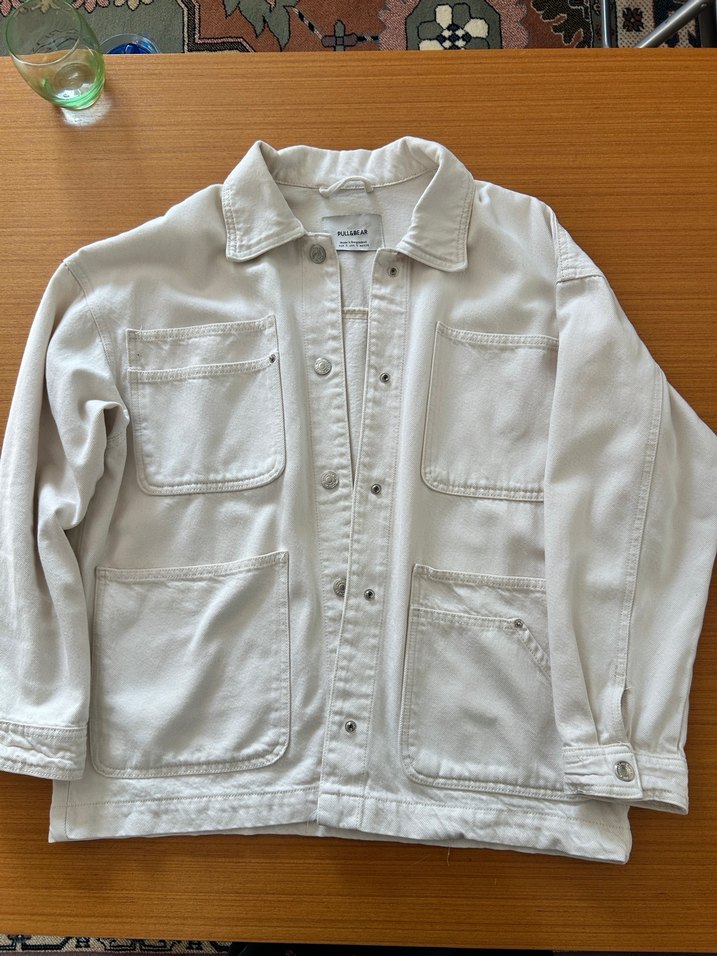 Düğmeli, uzun kollu, beyaz denim kadın ceket. Geniş kesim ve normal boyda, günlük rahat kullanıma uygundur.