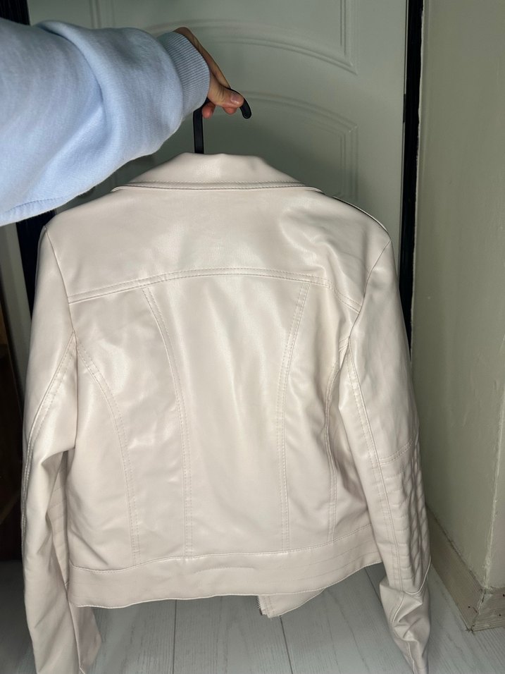 Düğmeli, beyaz renkli, uzun kollu ve normal boyda, dar kesim kadın deri ceket. Günlük sokak stili için uygundur.