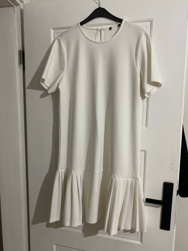 Düğmeli beyaz kadın elbise, yuvarlak yaka ve kısa kolludur. Pürüzsüz sentetik kumaştan üretilmiş, midi boyda ve normal kesimdir. Günlük kullanıma uygundur.