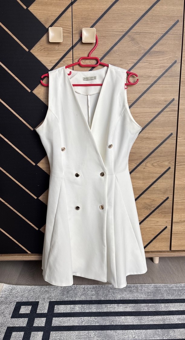 Düğmeli ön kısmı ve keskin yakasıyla beyaz, kolsuz elbise Sentetik kumaştan, rahat ve günlük kullanıma uygun.