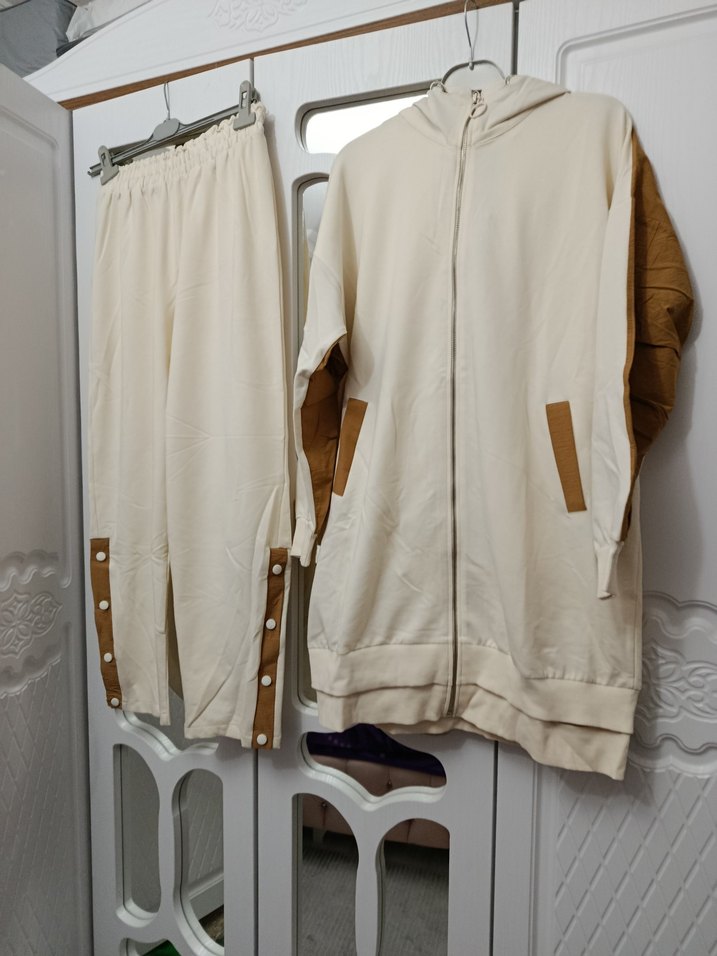 Düğmeli, uzun kollu, bol kesim beyaz kadın eşofman takımı. Yumuşak ve sıcak kumaştan, kahverengi detaylı, rahat günlük kullanım için uygun.