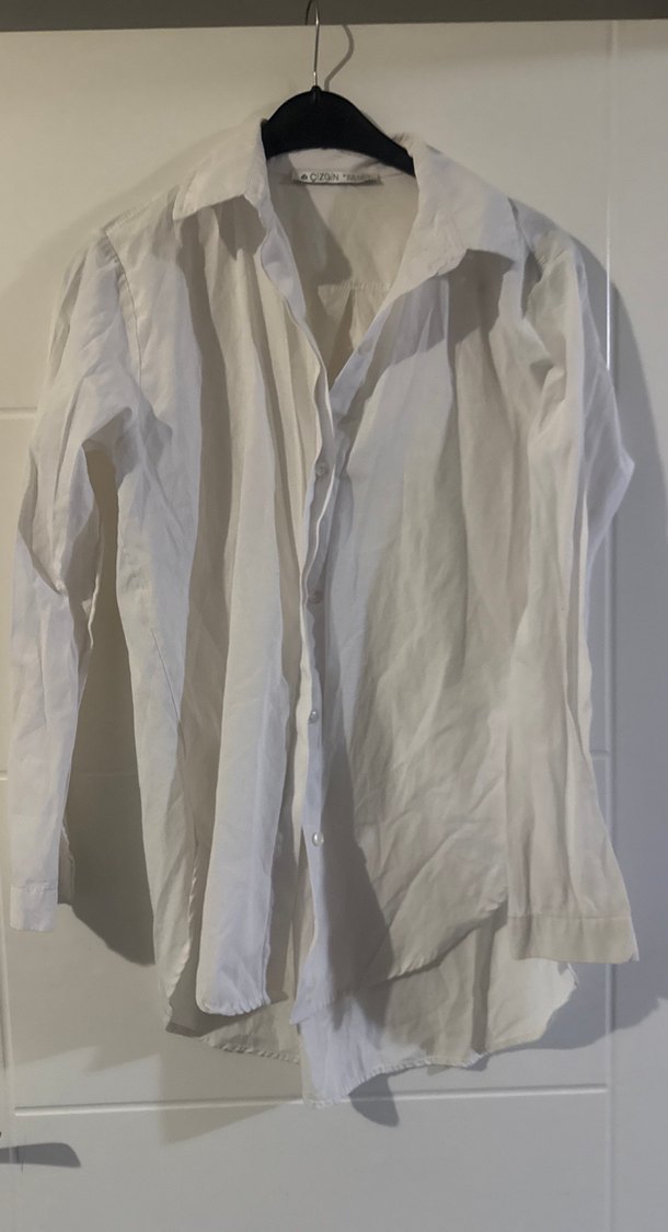 Beyaz kumaştan uzun kollu, düğmeli, yakalı ve bol kesim kadın gömlek. Ofis kullanımına uygun.