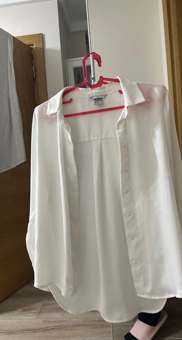 Düğmeli, yakalı ve uzun kollu beyaz kadın gömleği midi boyda, bol kesim ve ipeksi dokudadır. Minimalist ve sade tasarımı ofis ve günlük kullanıma uygundur.