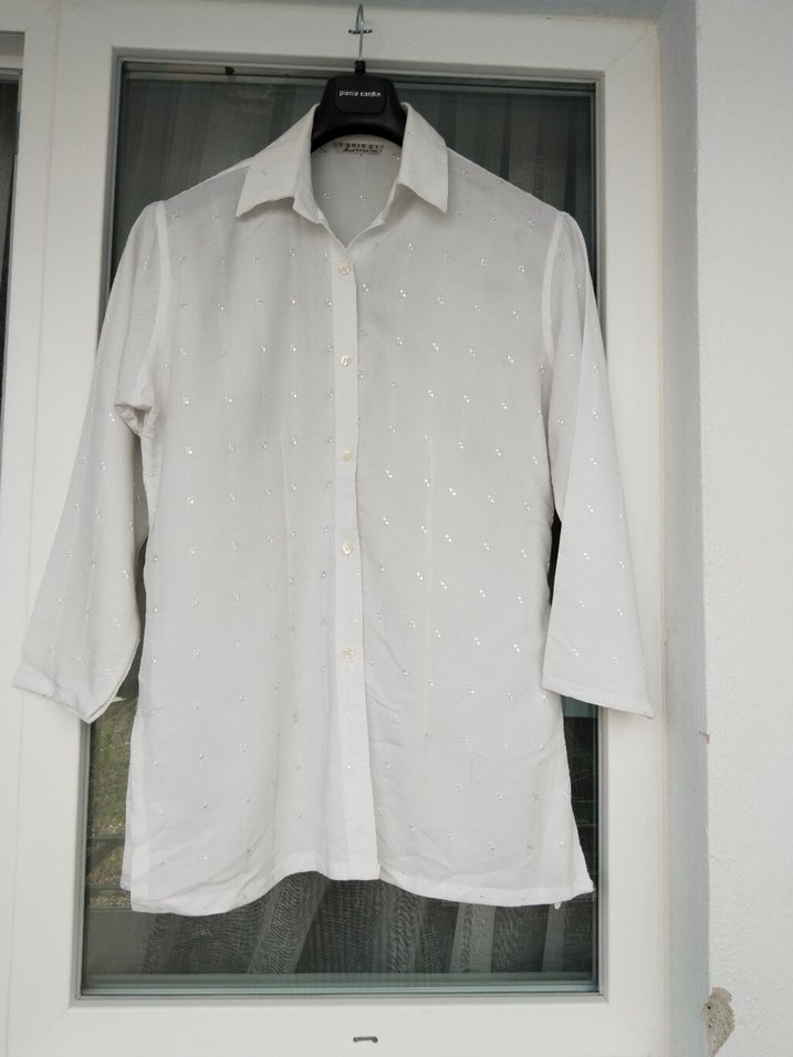 Düğmeli, beyaz pamuk kumaştan yapılmış gömlek. Kısa kollu sorunu yoktur.