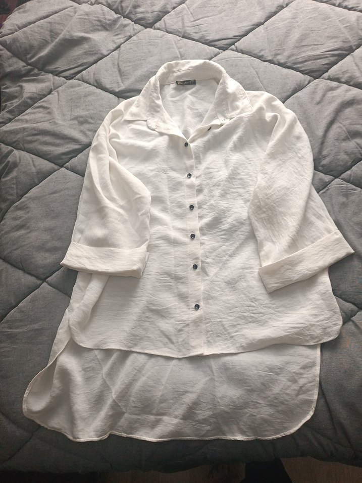 Düğmeli, yakalı ve kısa kollu beyaz gömlek, bol kesim ve Bohem tarz için uygundur.