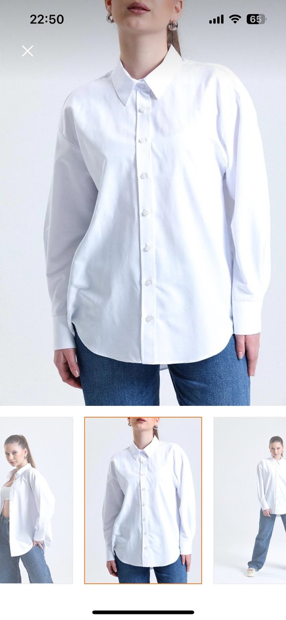 Pamuk kumaştan yapılmış, düğmeli, uzun kollu ve kayık yaka beyaz kadın gömleği. Rahat kesimi ve normal boyu ile günlük sokak stili için uygundur.