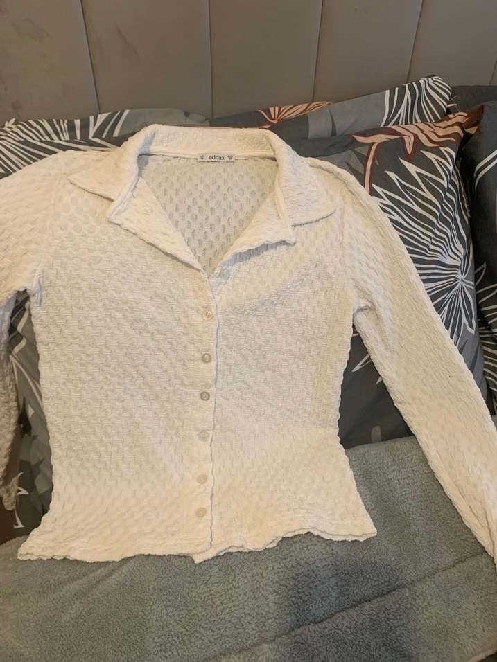 Uzun kollu, V yakalı ve düğmeli kadın gömleği. Dokulu kumaştan, beyaz renkte ve vücuda oturan midi boyda.