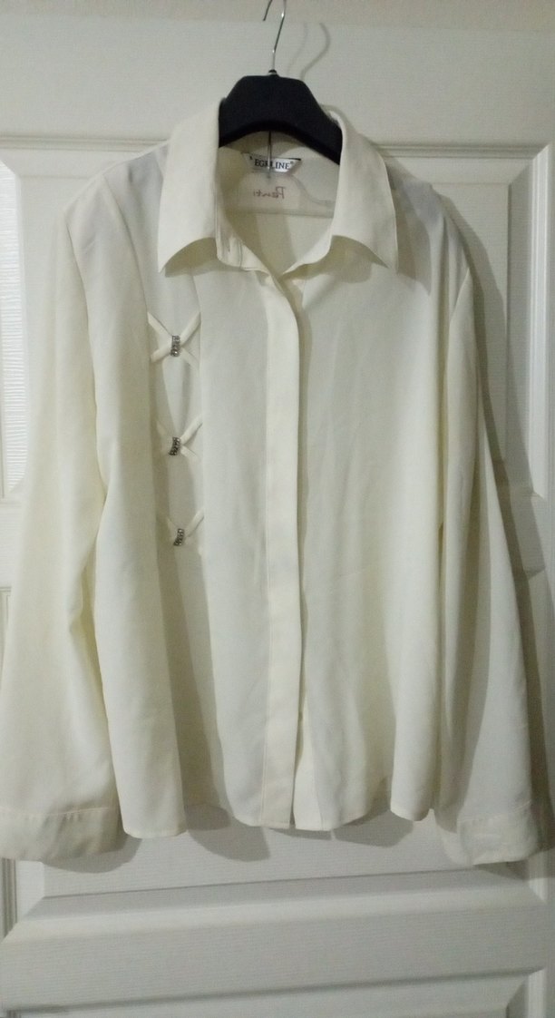 Düğmeli, uzun kollu, beyaz kadın gömleği. İpek gibi kumaştan, minimal ve normcore tarzda, ofis için uygun, bol kesim ve düz desensiz. ön kısmında hafif renk değişikliği var fotoğraflarda mevcut.bir iki kere giyildi