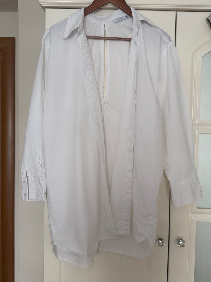 Düğmeli, beyaz, bol kesim kadın gömleği. Notlu yaka ve uzun kollu, ofis için uygun sade normcore tarzında.