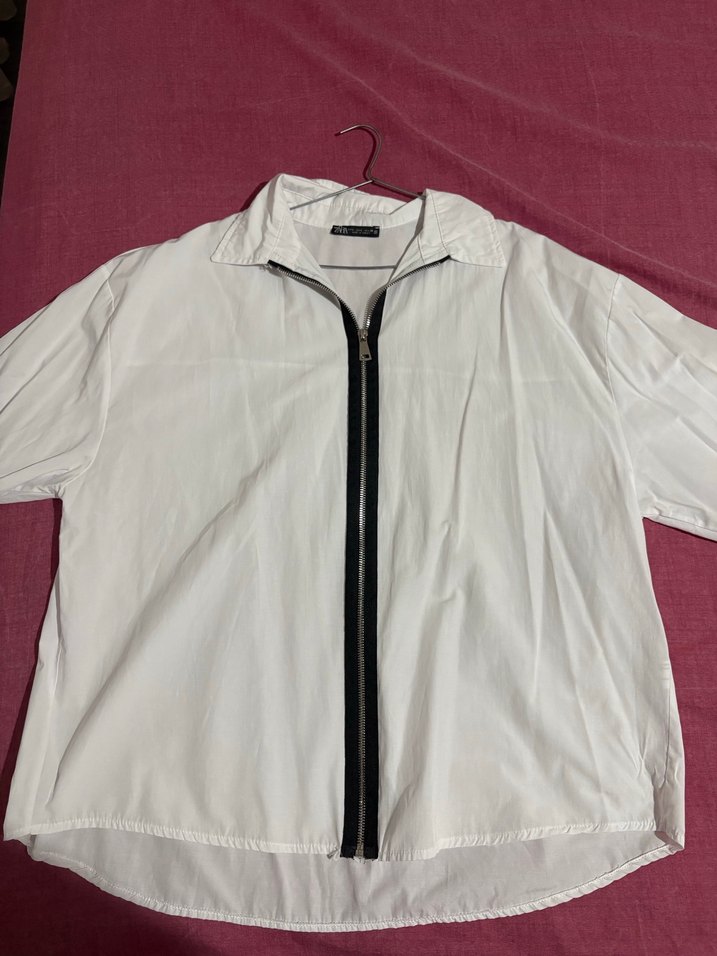 Düğmeli, yakalı beyaz kadın gömlek. Rahat kesim, uzun kollu ve minimalist tarzda, günlük kullanım için uygundur.