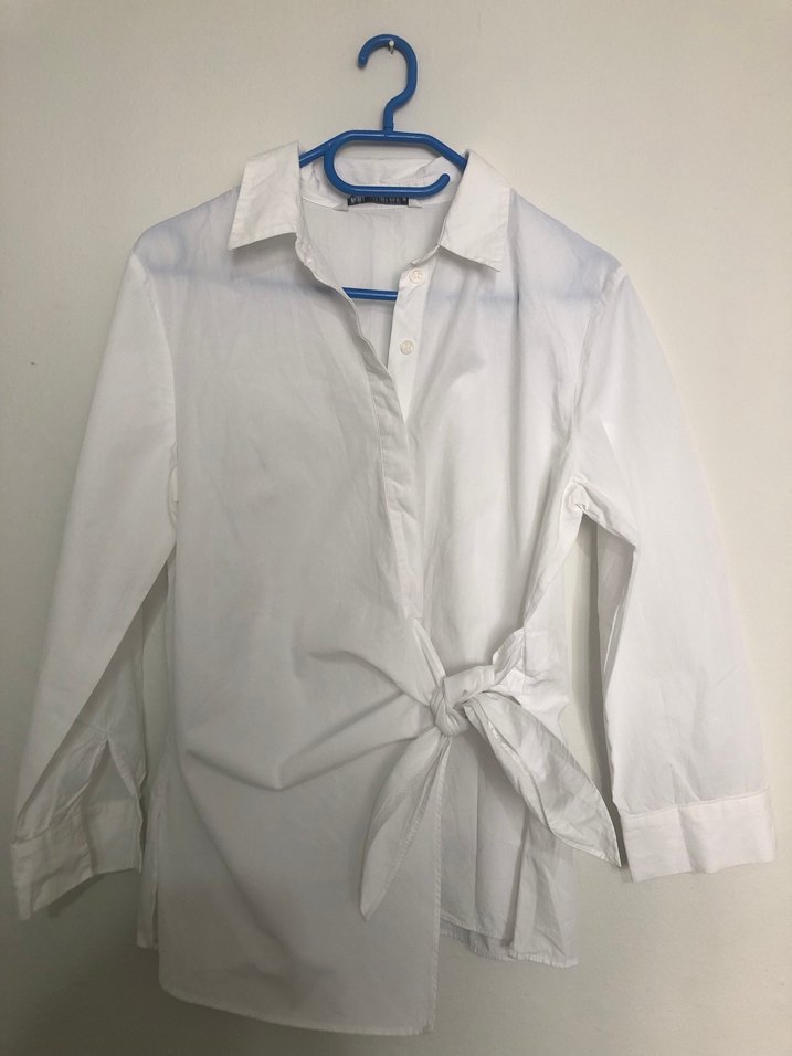 Düğmeli, yakalı ve uzun kollu beyaz pamuk gömlek. Belde bağlama detayı ile minimalist ve regular fit, ofis için uygun.