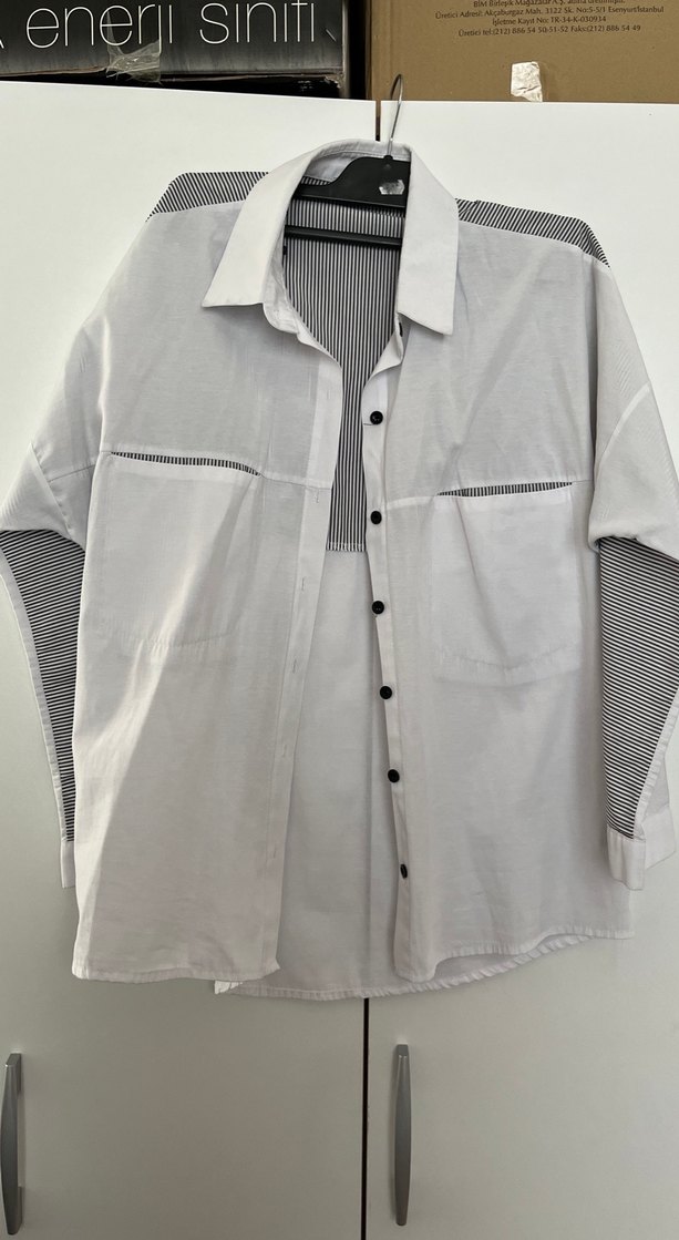 Düğmeli beyaz kadın gömlek, pamuklu kumaştan, regular fit ve uzun kollu. Midi boyda, iç kısımlarda gri çizgili detaylar bulunur. Günlük rahat tarz için uygundur. 2.03 kere giydim hiç hasar yok gayet temiz sadece ütüleme fırsatım olmadı