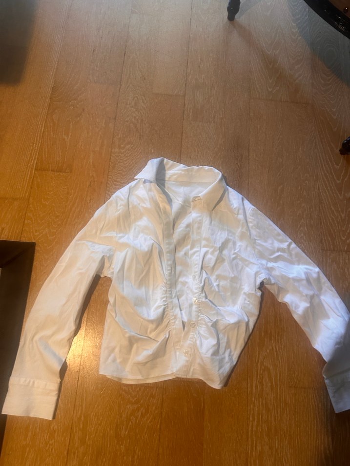 Düğmeli, yakalı ve uzun kollu beyaz gömlek. Fitted kesim ve midi normal boyda, ofis kullanımı için uygun.