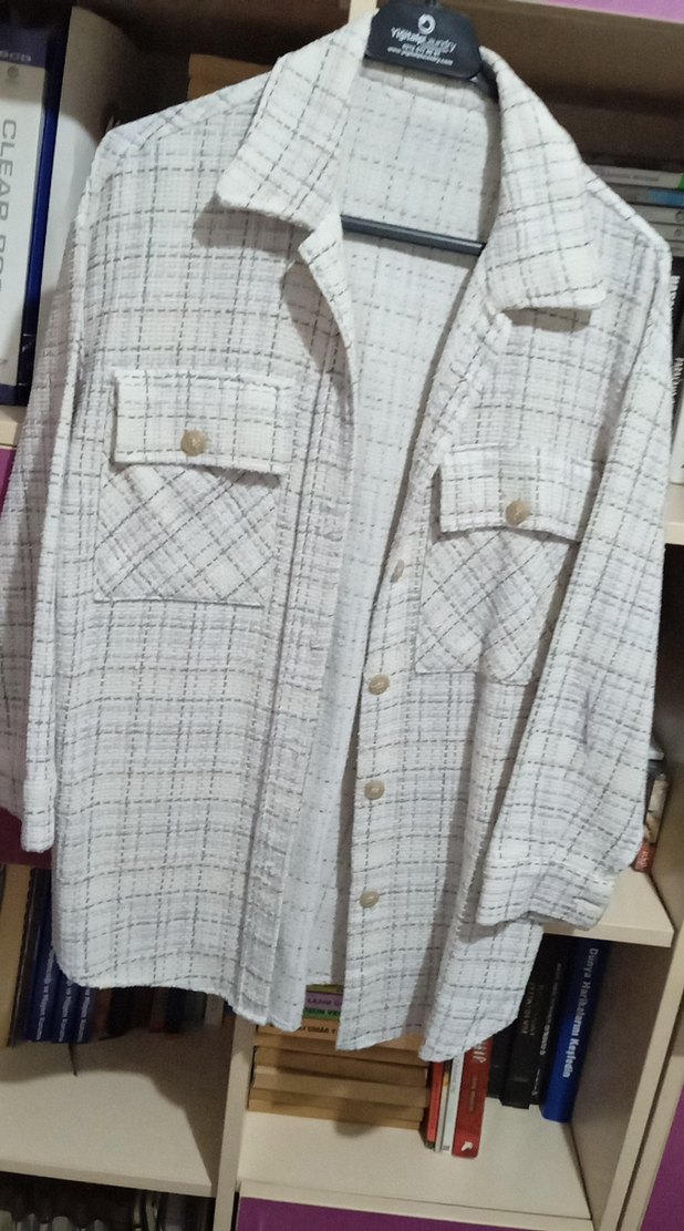 Beyaz pamuk gömlek, düğmeli ve kesik yakalıdır. Uzun kollu, normal kesim ve gri kare desenlidir. Midi boyda, günlük sokak stili için uygundur.