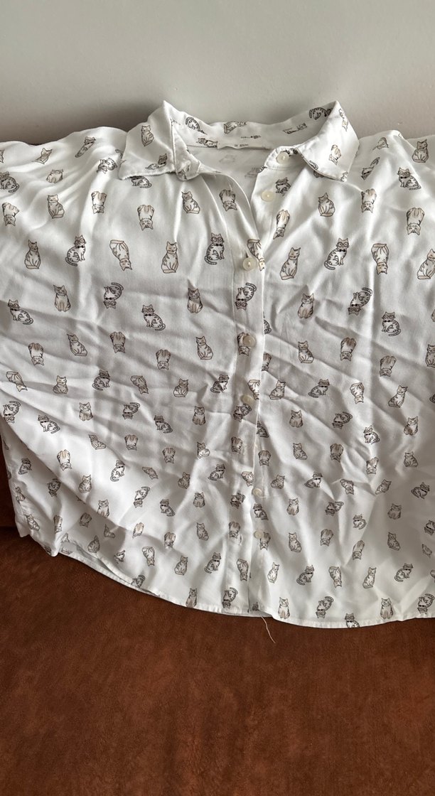 Düğmeli, yakalı ve kısa kollu beyaz kadın gömleği. İpek gibi kumaştan, bol kesim ve küçük kedi desenleriyle günlük kullanıma uygun.