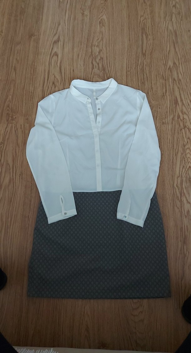 Düğmeli, uzun kollu ve yakalı beyaz kadın gömlek elbise Normal kesim ve sentetik kumaştan, ofis için uygun sade tasarım. boy 90 cm ,bel 48 cm,gögus 52 cm bir kez giyilmistir