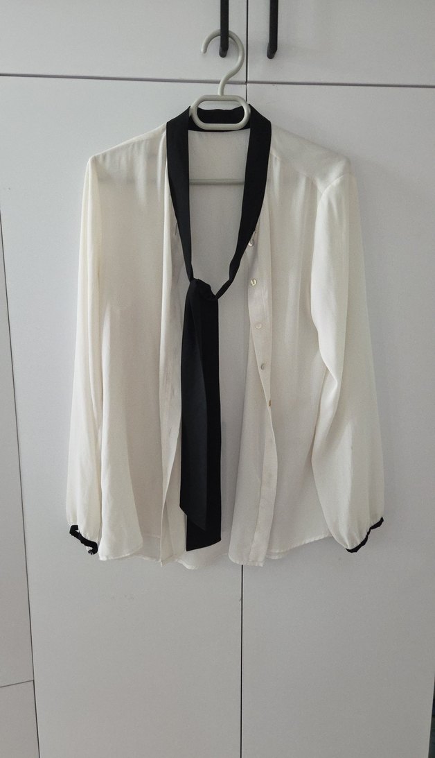 Düğmeli, ince siyah şal detaylı, uzun kollu, beyaz, bol kesim kadın gömleği. Ofis kullanımı için uygundur.