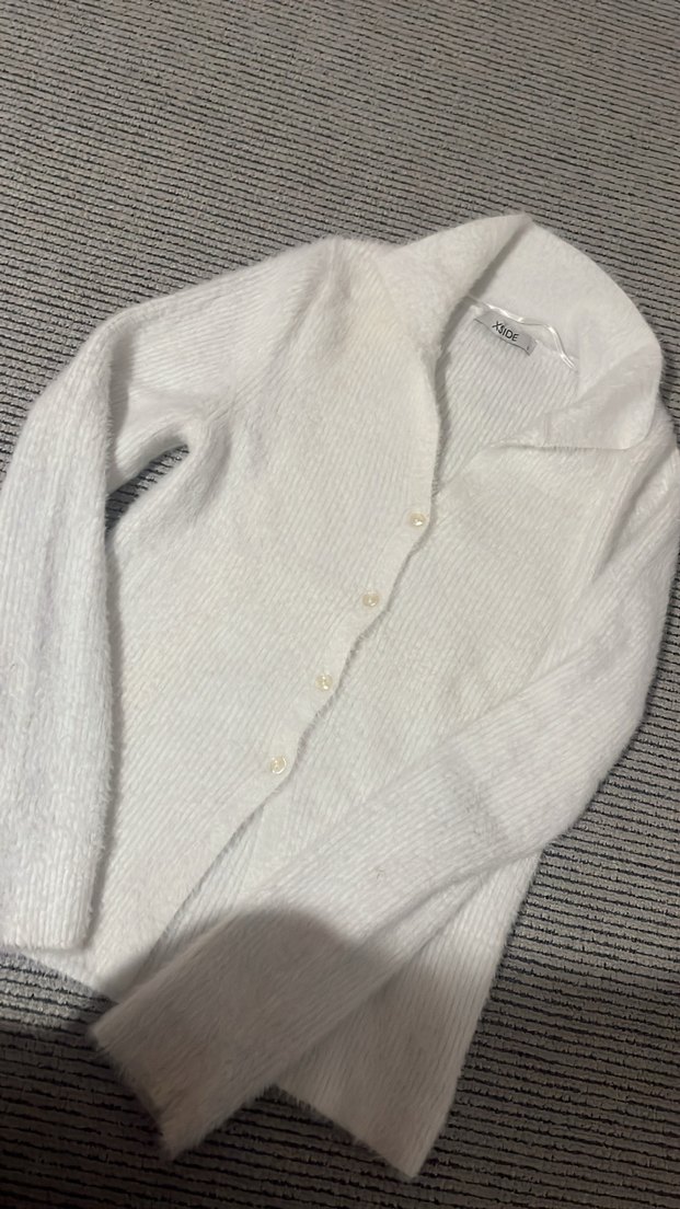 Düğmeli önü ve yakalı uzun kollu, ince triko kumaştan beyaz kadın hırka. Normal midi boyda, rahat günlük kullanıma uygundur.Az kullanıldı sorunsuz