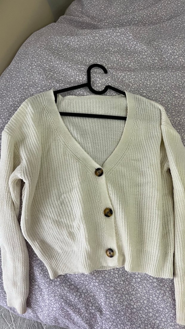 Düğmeli, beyaz renkli, V yakalı, uzun kollu, rahat kesim örme kadın hırka. Midi uzunlukta ve gündelik kullanıma uygundur.