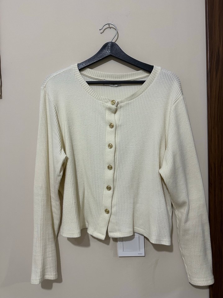 Pamuk kumaştan, düğmeli önü, uzun kollu ve yuvarlak yakalı beyaz hırka. Rahat kesimi ve midi boyuyla günlük kullanıma uygundur.