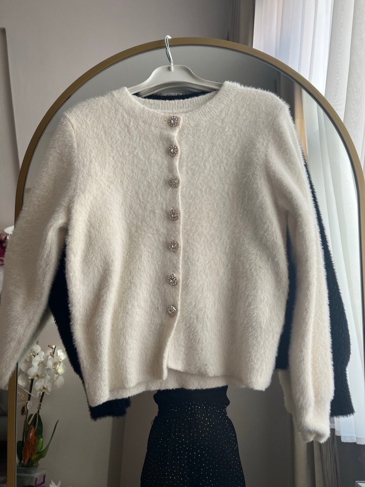 Beyaz örme kumaştan, uzun kollu, düğmeli, yuvarlak yakalı ve bol kesim kadın hırka. Günlük rahat kullanıma uygun midi boyda.